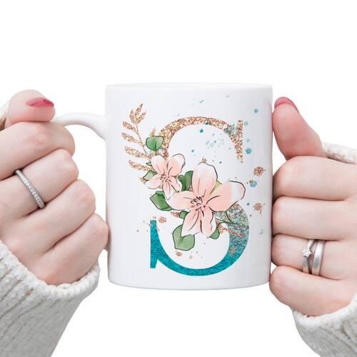 Caneca personalizada de porcelana de alto brilho, com interior e alça branca com linda Estampa Alfabeto Floral Glitter.
