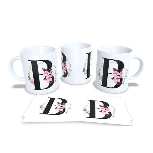 Caneca personalizada de porcelana de alto brilho, com interior e alça branca com linda Estampa Alfabeto Floral Gramur.