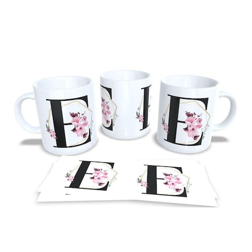 Caneca personalizada de porcelana de alto brilho, com interior e alça branca com linda Estampa Alfabeto Floral Gramur.