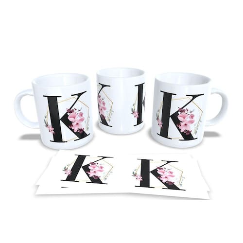 Caneca personalizada de porcelana de alto brilho, com interior e alça branca com linda Estampa Alfabeto Floral Gramur.