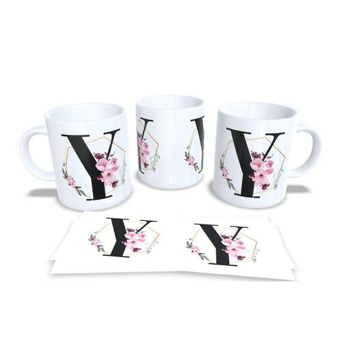 Caneca personalizada de porcelana de alto brilho, com interior e alça branca com linda Estampa Alfabeto Floral Gramur.