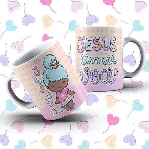 Caneca personalizada de porcelana de alto brilho, com interior e alça branca com linda Estampa Tema Evangelico.