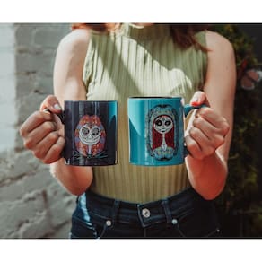 FRIGHT AND DELIGHT IN every drink What does you get when two holiday collide? Este conjunto exclusivo de canecas de café com Jack e Sally de The Nightmare Before Christmas de Tim Burton. Misturar feriados é o tipo deles. Tudo feito com tinta facial tradicional Calaveras, o casal assustador faz uma aparição como caveiras de açúcar nesta reimaginação do Dia dos Mortos. Ambos os retratos são emoldurados em decorações festivas, com Jack Skellington na caneca roxa e Sally adornando a caneca azul-petróleo. Mesmo na morte, eles realmente fazem o par perfeito. Algo especial para românticos sem esperança. Todos os seus desejos mais assustadores estão a apenas um copo de distância. Contemple as estrelas com seu outro significativo e uma bebida quente para aquecer seus ossos. Ama sua cara-metade em pedaços? Você certamente vai acabar com as bebidas oficialmente licenciadas da Disney. Instruções de cuidado: lavar à mão apenas, não pode ir à máquina de lavar louça, não é seguro