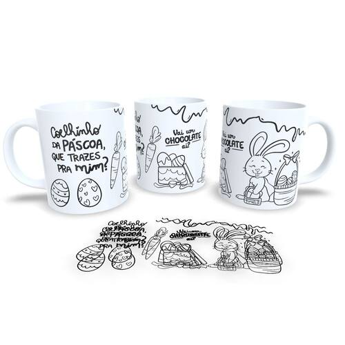 Caneca personalizada de porcelana de alto brilho, com alça e interior branca Coleção Páscoa.