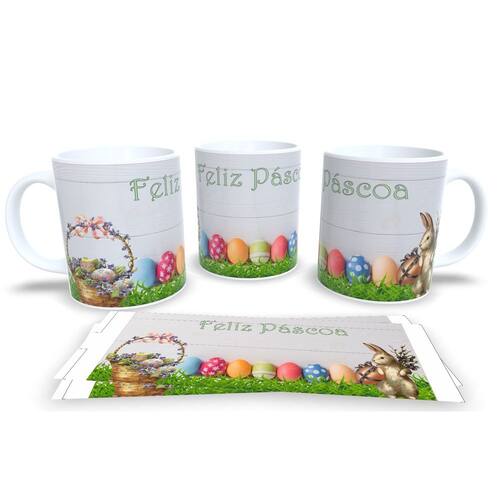 Caneca personalizada de porcelana de alto brilho, com alça e interior branca Coleção Páscoa.