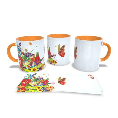 Caneca personalizada de porcelana de alto brilho, com interior e alça Laranja com linda Estampa da Coleção Flores.
