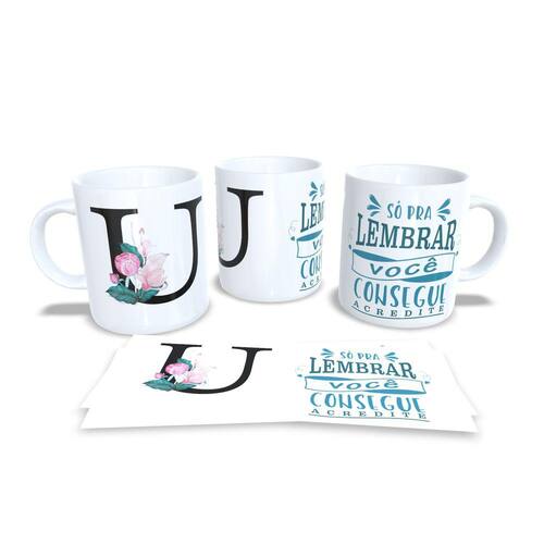 Caneca personalizada de porcelana de alto brilho, com interior e alça branca com linda Estampa Alfabeto Flores.