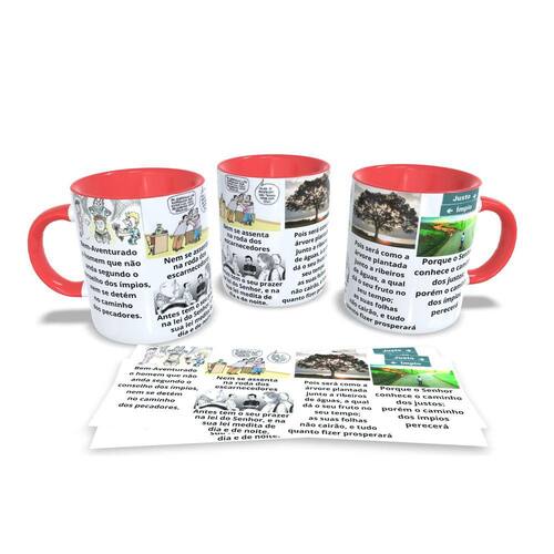 aneca personalizada de porcelana de alto brilho, com interior e alça branca com linda Estampa da Coleção Salmos 1.