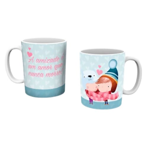 Caneca personalizada de porcelana de alto brilho, com interior e Alça branca Coleção Dia dos Amigos.