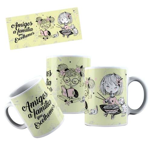 Caneca personalizada de porcelana de alto brilho, com interior e Alça branca Coleção Dia dos Amigos.