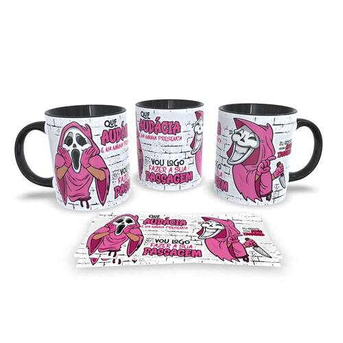 Caneca personalizada de porcelana de alto brilho, com interior e alça Preta com a Estampa Amostradinho.