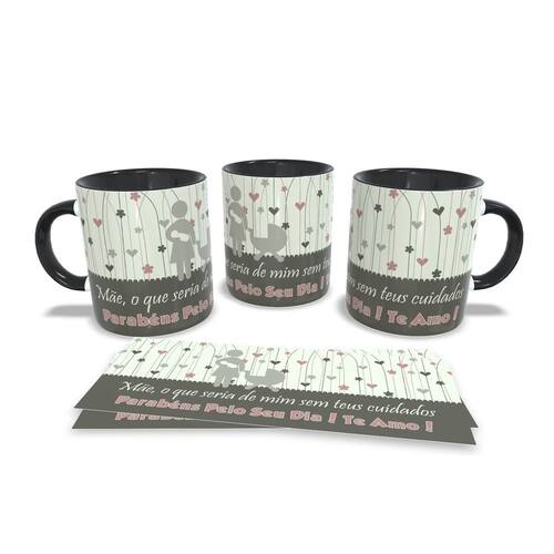 Caneca personalizada de porcelana de alto brilho, com interior e alça Preta com linda Estampa da Coleção dia das Mães.