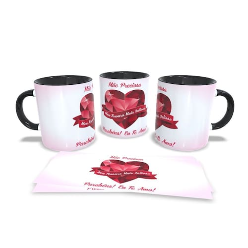 Caneca personalizada de porcelana de alto brilho, com interior e alça Preta com linda Estampa da Coleção dia das Mães.