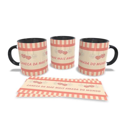 Caneca personalizada de porcelana de alto brilho, com interior e alça Preta com linda Estampa da Coleção dia das Mães.