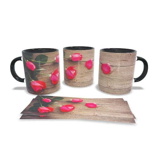 Caneca personalizada de porcelana de alto brilho, com interior e alça Preta com linda Estampa da Coleção Flores.