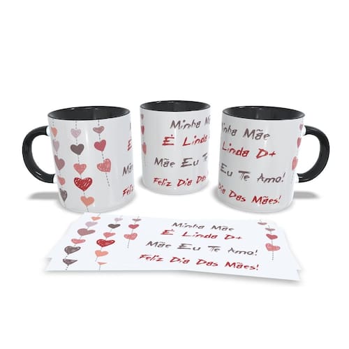 Caneca personalizada de porcelana de alto brilho, com interior e alça Preta com linda Estampa da Coleção dia das Mães.