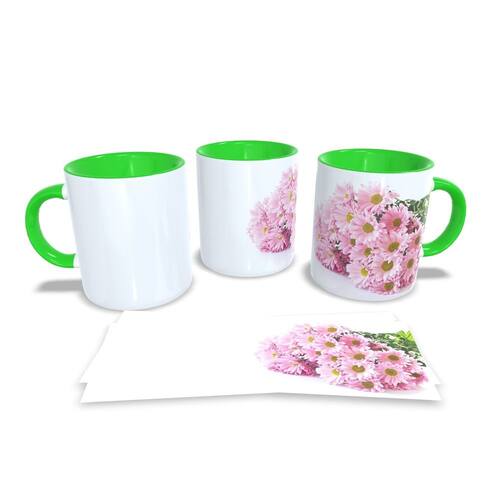 Caneca personalizada de porcelana de alto brilho, com interior e alça Verde com linda Estampa da Coleção Flores.