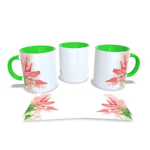 Caneca personalizada de porcelana de alto brilho, com interior e alça Verde com linda Estampa da Coleção Flores.