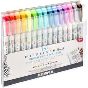 Faça um impacto impressionante em cores suaves com As Canetas De Pincel Mildliner da Zebra! Convenientemente de duas pontas, essas canetas coloridas sem sangramento apresentam uma ponta de pincel de tinta e uma ponta de marcador fina para todas as aplicações de letras manuais. A ponta média do pincel ajuda você a obter traços fluidos e elegantes com o mínimo de esforço para cabeçalhos criativos e títulos, e a ponta de bala fina facilita a criação de linhas previsíveis e limpas. O marcador de pincel Mildliner da Zebra apresenta tinta pigmentada resistente à água que não sangra; a cor única aparece suavemente no papel e é excelente para camadas e mistura. Com sua tinta de qualidade de arquivamento sem ácido que desliza suavemente através do papel, o Mildliner Brush sem sangramento é a escolha ideal para diários de bala, scrapbooking e outras aplicações criativas. Desde títulos elaborados e listas de tarefas até calendários, metas mensais e rastreadores de humor, o conjunto Zebra Mildliner Brush melhorará seus designs de página e permitirá que você crie seu projeto artístico exatamente do jeito que você imaginou. Alojada em um barril branco com design mínimo e limpo e um clipe de bolso conveniente que indica a cor do marcador, o Zebra Mildliner Brushes complementará seu conjunto de Marcadores Criativos Zebra Mildliner. Se você está usando os Pinceles Zebra Mildliner para o seu diário de bala, planejador, letras de mão ou estudando para o seu próximo exame, ele vai ajudá-lo a se expressar de uma maneira única!