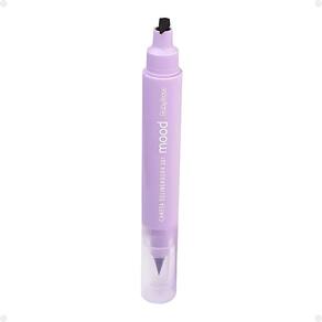 Agite a caneta delineadora antes de usar. Use a ponta fina para delinear a linha dos cílios, começando do canto interno ao canto externo da pálpebra. Para criar o "gatinho", utilize a ponta carimbo e pressione suavemente no canto externo do olho. Conecte a linha dos cílios com o carimbo, preenchendo e ajustando conforme necessário para um acabamento perfeito. Repita o processo no outro olho, garantindo que ambos os delineados fiquem simétricos. Deixe secar por alguns segundos para evitar borrões.
