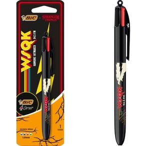 A Caneta BIC 4 Cores e um icone de mercado! Nesse modelo classico que conta com tintas classicas, com apenas um clique no botao, voce seleciona a cor que deseja. Cada Caneta ainda possui corpo ilustrado com Demogorgon, dando um ar enigmatico e cheio de personalidade para essa caneta tao iconica da BIC. As Canetas contam com ponta media de 1.0mm com largura da linha de 0.32mm. Alem disso, nao travam durante o uso! Conjunto de Canetas com 1 Unidade.