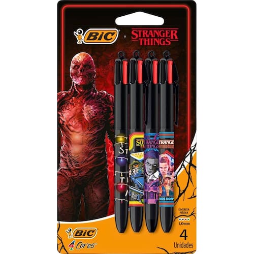 Descrição do produto : A Caneta BIC 4 Cores e um icone de mercado! Nesse modelo classico que conta com tintas classicas, com apenas um clique no botao, voce seleciona a cor que deseja. Cada Caneta ainda possui corpo decorado com os marcos das 4 primeiras temporadas de Stranger Things, dando um ar enigmatico e cheio de personalidade para essa caneta tao iconica da BIC. As Canetas contam com ponta media de 1.0mm com largura da linha de 0.32mm. Alem disso, nao travam durante o uso! Conjunto de Canetas com 4 Unidades. :
