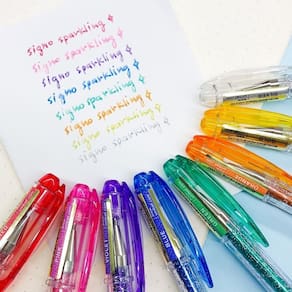 A caneta Signo Gel Sparkling tem tinta com glitter em sua composição, possui alta durabilidade, usabilidade e rendimento. Sua maior característica é o mecanismo de controle de fluxo para uma escrita suave (livre de borrões) e traçado contínuo sem falhas até o final de sua tinta. Signo Gel atende as mais diversas utilizações em papéis como Offset, Cartolina, Couche, Kraft, Reciclado, Papel Aquarelável, Canson, entre outros. Além de linda, a linha sparkling decora seus textos de forma vibrante, com cores bonitas e brilhantes!