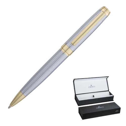 Caneta Esferográfica Crown Ref: Di11481x Supreme Prata/Dourado Caneta Esferográfica Comprimento: 13,9 cm Diâmetro: 1,4 cm Peso Aproximado: 41g Ponta Média Acompanha uma Carga Acoplada na Caneta Abertura: Torção Materia do corpo: Metal de 1 Ano Marca: Não Informado