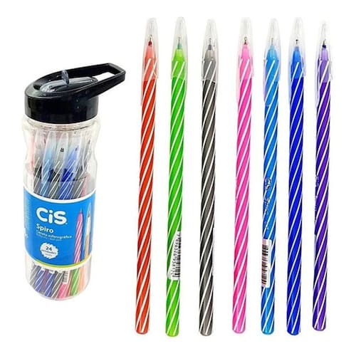 Corpo plástico flexível e tampa ventilada com clip; Ponta fina 0,7 mm; Corpo listrado na cor da tinta; Traçado macio.