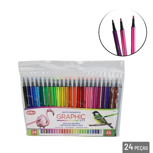 Caneta Hidrográfica 24 Cores 2.0mm Graphic - A Caneta Graphic 2.0 mm, ideal para desenhos e pinturas de todos os tipos;\n- Possui cores vibrantes, maior precisão, alta durabilidade, cobertura perfeita, formato ergonômico;\nEspecificações:\nMarca : DAIWA\nTipo de material : Resinas termoplásticas, base de água, corantes e umectantes, pavio de acetato e fibra de poliéster\nCores ou Estampa : Colorido\nDimensões do Produto : 8cm X 1,5cm X 1,5cm CM\nDimensões da Embalagem : 12,5 X 21 X 1,5 CM\nPeso Bruto (Gramas) : 0.077 Marca: Não Informado