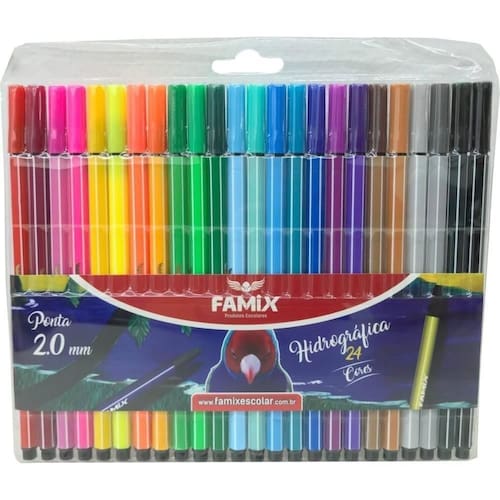 Caneta hidrografica hexagonal 24 cores Unidade: estojo Caneta hidrografica x 24 cores. Corpo hexagonal, confeccionado em resina termoplastica pp na cor da tinta, comprimento de 163 mm com tampa e 154 mm sem tampa e diametro de 7 mm, com tampa inferior plug traseiro com encaixe nao rosqueavel, tampa superior removivel sem haste para fixacao em bolso e sem furo para nao secar a tinta, com a cor da tinta, carga a base de agua com medida minima de 100mm, corantes e umectantes, pavio de acetato e ponta de fibra de poliester, escrita de 2.0 mm. Marca: Não Informado