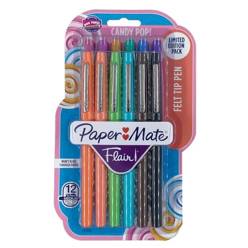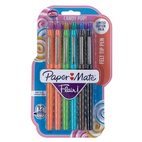 Caneta Hidrográfica Paper Mate Flair Candy Pop 12 Cores Coleção estonteante de cores pop, tropicais e clássicas de Candy pop para desenhos e rabiscos. Possuem a ponta de feltro que resiste ao uso frequente. Permite um traço médio de 0.7mm e não transferem tinta para o outro lado da folha.