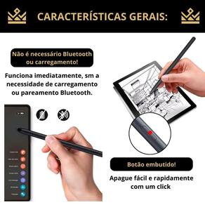 Caneta touch com alta precisão e sensibilidade para desenho, escrita e navegação. Ajuda a manter a tela limpa, evitando marcas de dedos. Não requer emparelhamento Bluetooth, pronta para uso imediato. Inclui kit com 3 pontas extras.