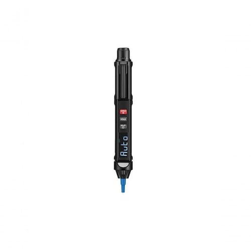 Multímetro inteligente tipo caneta, este instrumento pode identificar automaticamente sinais de Tensão DC, Tensão AC, Resistência, Capacitância, Diodo, teste de Continuidade, sem qualquer comutação. Também realiza medidas de Frequência, Detecção de Tensão Sem Contato (NCV), Linha Viva, Sequência de Fase e Temperatura Ambiente. Principais características:Display: LCD Colorido 3 5/6 Dígitos, 5999 Contagens;Taxa de Amostragem: Aprox. 3 vezes por segundo;True RMS AC;Indicação de Sobrefaixa: OL é mostrado no display;Indicação de Bateria Fraca: O símbolo será mostrado quando a tensão da bateria estiver abaixo do nível de operação;Auto Power Off: Aprox. 5 minutos;Conversor A/D duplo;Mudança de Faixa: Automática;Função Data Hold;Função NCV / Live;Lanterna: Cor azul;Fasímetro;Ambiente:- Operação: 0C a 40C, U.R.<80%;- Armazenamento: -20C a 60C, U.R.<90%;Altitude:- Operação: até 2.000 metros;- Armazenamento: até 2.000 metros;Grau de Poluição:2;Alimentação: 1 x 1,5V tipo AAA;Dimensões: 170(A) x 24(L) x 21(P)mm;Peso: Aprox. 50 g (incluindo bateria);