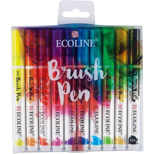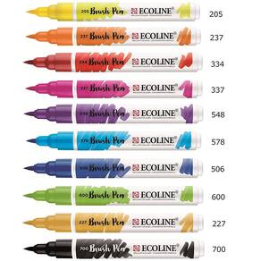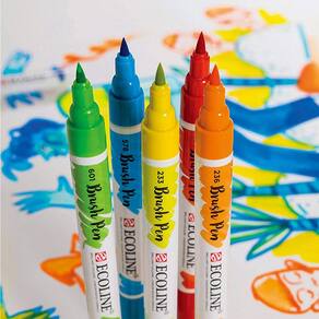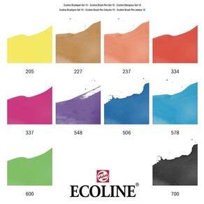Os Ecolines Brush Pen são muito mais fáceis de usar. Úteis para transportar e ideais para serem utilizados em lugares que precisam ser mantidos limpos, os brush pen estão prontos para o uso e são livres de odores. A fórmula de Talens Ecoline utilizada nos Brush Pen é mais concentrada do que a encontrada nos frascos, o que garante que o uso combinado dos dois produtos resulte em uma perfeita transição das cores. Utilizando o Brush Pen especial BLENDER, as cores podem se misturadas ou esfumadas, podem também ser criados maravilhosos efeitos aquarelados e degradê. Se deixou seu brush pen aberto após o uso e a ponta secou, ela poderá ser facilmente recuperada apenas sendo umedecida com um pouco de água. Especificações Técnicas: Medida da caneta com tampa: 14 x 1,5 x 1,50 cm; Comprimento da ponta: 9 mm. Estojo de acetato contendo 10 cores sendo: 205 lemon yellow, 237 deep Orange, 334 scarlet, 337 magenta, 548 blue violet, 506 ultramarine deep, 578 sky blue (cyan), 600 green, 227 yellow ochre, 700 black Origem da Marca: Holanda