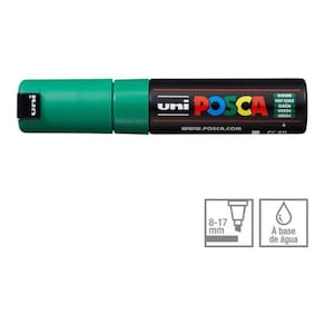 Caneta Posca Pc-8K Verde Ponta Bisel 8 A 17Mm Espessura do traço: 8mm. A 17mm A ponta larga do cinzel do pc-8k é perfeita para traçar curvas e cobrir grandes áreas. Características do produto - marcador multiuso. - à base de água. - cores vivas e intensas. - uso em papéis claros e escuros. - não tóxico. - espessura do traço: 8-17mm. - escreve aproximadamente 200 metros. Uso: Com sua ponta larga de cinzel, o pc-8k não só pode desenhar curvas claras com um efeito gráfico de caligrafia; também pode colorir áreas amplas. Disponível em uma enorme ampla variedade de cores, é ideal para cores planas, marcas de todos os tipos e, claro, criações de arte de rua e letras Destino O pc-8k permite que os artistas pintem e desenhem em qualquer superfície, em ambientes fechados ou ao ar livre; decoradores para dar reformas a quartos, móveis, objetos e tecidos; surfistas e skaters para decorar suas pranchas; profissionais para decorar vitrines. Eficiente Pode cobrir rapidamente grandes áreas. Preciso A ponta do cinzel permite movimentos controlados e refinados. Conveniente Ao contrário de uma caneta de feltro de ponta larga convencional, a ponta pode ser removida e lavada se ficar manchada ou seca. Económico Para uma vida de marcador ainda mais longa, a ponta também pode ser substituída por uma nova. Secagem rápida: após a aplicação, a secagem é ultrarrápida. Você só precisa de 1 a 2 minutos para ter a peça trabalhada com um acabamento perfeito e sem falhas Variedade de pontas: o marcador posca traz 8 níveis com variações de 0,7mm a 22mm de espessura. Tecnologia : os componentes das tintas dos marcadores posca são misturados através de uma interna, que proporciona à tinta uma textura homogênea e garante um acabamento de qualidade para a sua atividade. 100% cobertura: após aplicar a primeira cor, espera secar durante 1 minuto, e você já pode passar uma segunda cor por cima, sem manchar a que está embaixo, e com uma excelente cobertura sem falhas faça quantas camadas quiser quantos detalhes quiser, um por cima do outro Tampa: a tampa garante um fechamento hermético do marcador, assegurando uma excelente duração e conservação do produto. Todas as pontas dos marcadores posca são laváveis, reversíveis e posicionáveis. Como utilizar: mantenha o marcador com a tampa fechada e agite o produto por alguns segundos para que a tinta fique homogênea. Pressione a ponta sobre uma superfície lisa até a tinta preencher a ponta do marcador. Para manter o fluxo contínuo, basta bombear a ponta do marcador na superfície. Ganhe tempo, economize e otimize seus trabalhos Como usar Posca na mão Posca na mão pra tirar a ideia da cabeça. E, pra fazer a cor fluir, é só seguir os passos aqui do lado. Bora transformar o mundo com arte 1. Chacoalhe Chacoalhe a caneta por alguns segundos para que todos os pigmentos se misturem. 2. Destampe Destampe a caneta. Obs.: caso sua posca nunca tenha sido Utilizado, a ponta ainda estará sem tinta. Pode ficar tranquilo 3. Pressione Pressione repetidamente em um papel ou superfície descartável até que a tinta desça para a ponta. 4. Risque Risque alguns traços na superfície descartável para dosar a quantidade de tinta que deseja para sua arte. Ponta pincel Ah, temos uma exceção: a nossa caneta pcf-350. Por ter uma ponta pincel, colocamos um botão no topo para que fosse possível fazer a tinta descer sem estragar as cerdas. Pode ser que, durante o processo de criação, seja necessário pressionar mais algumas vezes no papel ou superfície descartável. Isso deixará a ponta sempre com tinta e garantirá traços mais uniformes. Possibilidades: · aquarelável · crie novas cores · faça camadas