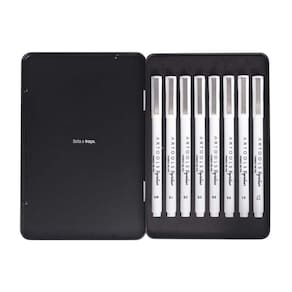 -estojo metálico com 8 canetas -graduações das pontas: 0.05, 0.1, 0.2, 0.3, 0.5, 0.8, 1.0 e chanfrada -traço intenso de alta pigmentação -tinta resistente à ação da luz e da água -medidas do estojo: 18,5x12,5x1,5 cm -peso do estojo: 0,186 kg -referência: 689142 Ean: 7897476689142
