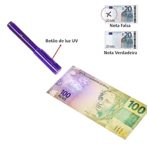 A Caneta Testa Detecta Dinheiro Falso Luz Uv Com Luz Negra possui uma Mini Lanterna de Luz Ultra Violeta, que é capaz de ressaltar as marcas d'água nas notas de dinheiro, facilitando a identificação de cédulas falsas. Além disso, a caneta também funciona como um marcador: basta fazer um pequeno risco na cédula e observar a cor do traço. Se o traço for incolor ou amarelo claro, a nota é verdadeira. Por outro lado, se o risco for escuro, a cédula é falsa. Essa função funciona em qualquer tipo de papel moeda nacional e estrangeiro, como reais, dólares, euros, entre outros.