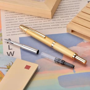 Especificações: - Marca: Jinhao - Material: metal. - Ponta: Ponta extrafina irídio (aproximadamente 0,40 mm) - Tinta: serve para todas as tintas engarrafadas sem carbono ou cartuchos de tinta calibre 5,5 mm - Comprimento: 141,5 mm / 5,57 polegadas - Diâmetro: 13 mm - Peso da caneta: 33 g Embalagem: - 1 caneta-tinteiro. - 1 conversor de tinta (no barril da caneta). - 1 caixa de metal. Aviso: - Esta caneta-tinteiro não contém cartuchos de tinta para segurança em trânsito. - Cada caneta é verificada à mão e escrita por um artesão, e pode haver um pouco de resíduo de tinta na ponta. - Lindo acabamento em ouro fosco escovado: a caneta-tinteiro Jinhao 10 Press em ouro fosco escovado oferece um design impecável e minimalista com uma laca metálica fosca e padrão listrado, perfeita para aqueles que apreciam a estética pura e refinada. - Escrita suave com ponta artesanal: experimente o prazer de escrever com uma ponta extrafina finamente trabalhada que oferece uma experiência de escrita suave e suave, perfeita para uso diário e tarefas de assinatura. - Mecanismo prático ativado por pressão: uma simples pressão estende a ponta para uso imediato. O "obturador" embutido na abertura da ponta oferece excelente vedação quando retraída, evitando que a tinta seque ou vaze. - Estrutura estável e durável: o mecanismo de mola interno do botão de pressão garante que a ponta permaneça firmemente no lugar durante o uso, oferecendo uma experiência de escrita estável e confortável sem qualquer movimento indesejado. - Embalagem elegante para presente: a caneta é acompanhada por uma elegante caixa de metal e papel, o que a torna a escolha ideal para uso pessoal ou como um presente sofisticado.