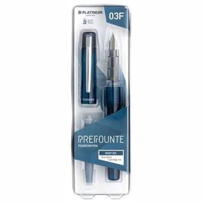 A caneta tinteiro Platinum Prefounte tem um belo design e característica minimalista, com um visual inteligente e simples, mas extremamente elegante. A tampa é translúcida, com um clipe de bolso de metal. O sistema de alimentação de alta tecnologia garante um fluxo de tinta constante, enquanto o mecanismo Slip & Seal na tampa garante uma boa vedação para que a tinta não seque, mesmo se não for usada por um ano ou mais. Cores suaves são empregadas para o corpo transparente feito de resina, o clipe de metal adiciona um toque para produzir uma aparência elegante e translúcida, ideal para os amantes da escrita. A ponta de aço inoxidável possui uma ponta soldada feita de uma liga especial resistente à abrasão, que proporciona uma excelente sensação de escrita. Aceita cartuchos de tinta Platinum um cartucho azul-preto está incluído ou pode-se usar conversor Platinum vendido separadamente para preencher com tinta de caneta tinteiro.