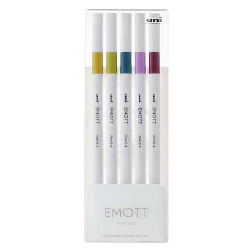Emott 5C Estojo Nº8 com 5 unidades nas cores Verde Azulado, Roxo Iris, Vermelho Vinho, Maçã Verde e Amarelo Palha. Caneta extra fina, ponta 0, 4 mm. A ponta super fina é durável e resistente a rachaduras ou flexões, portanto a largura da linha de o, 4 mm permanece constante.