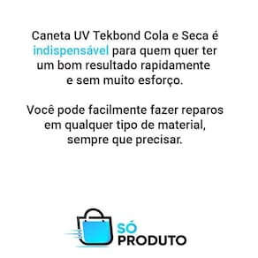 DescriçãoCaneta uv tekbond cola e seca é uma cola indispensável para quem quer ter um bom resultado rapidamente e sem muito esforço faça reparos duradouros em segundos com a caneta uv tekbond cola e seca. Basta aplicar a resina e ativar o local com a luz uv presente na caneta para promover uma solda resistente ou preencher rachaduras. Com a caneta uv tekbond cola e seca, você pode facilmente fazer reparos em qualquer tipo de material, sempre que precisar.DetalhesA cola uv é ideal para materiais difíceis de serem soldados, como plástico, vidro e metal. É uma ótima opção para quem quer fazer reparos rápidos e duráveis.EspecificaçõesMarca tekbondContém 1 unidade de 4gCor transparenteAdesão fácil, forte e rápidoValidade: 12 mesesCaracterísticasBasta aplicar a resina e ativar o local com a luz uv presente na caneta para promover uma solda resistente ou preencher rachaduras.As imagens são meramente ilustrativas