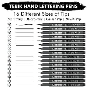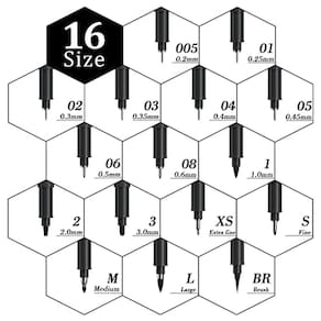 Conjunto de 16 canetas de caligrafia: 16 tamanhos diferentes de pontas de tinta preta, incluindo 005 (0,2 mm), 01 (0,25 mm), 02 (0,3 mm), 03 (0,35 mm), 04 (0,4 mm), 05 (0,45 mm), 06 (0,5 mm), 08 (0,6 mm), 1 (1,0 mm), 2 (2,0 mm), 3 (3,0 mm), XS (Extra fino), S (fino), 1* M (médio), 1* L (grande), 1* Br (pincel) para uso múltiplo.