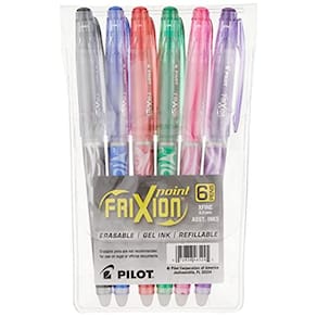 Pilot, FriXion Point Canetas de tinta de gel apagáveis e recarregáveis, ponta extrafina, 0,5 mm, pacote com 6, cores diversas - Escrita sem desconforto: escreva, apague e reescreva repetidamente sem danificar seus documentos; a tinta termossensível exclusiva desaparece completamente com o atrito de apagamento - Design inovador: a tecnologia patenteada Synergy Tip proporciona durabilidade e escrita incrivelmente suave; variedade de canetas multicoloridas em 1 pacote conveniente - Versátil: inspire talento e imaginação com esta coleção colorida; perfeita para edição, calendários e anotações em agendas; o ponto de precisão extra fino permite que você aperfeiçoe todos os detalhes - Recarregável e de secagem rápida: refis (vendidos separadamente) economizam dinheiro; tinta de secagem rápida evita manchas e manchas; pacote com 6 unidades inclui canetas pretas, verdes, azuis, roxas, vermelhas e rosa - Potência para a caneta: Expresse-se sem esforço com a linha de ferramentas de escrita inovadoras da Pilot - incluindo tinta gel, apagável, esferográfica, esferográficas e canetas-tinteiro - além de marcadores, marcadores apagáveis a seco e muito mais