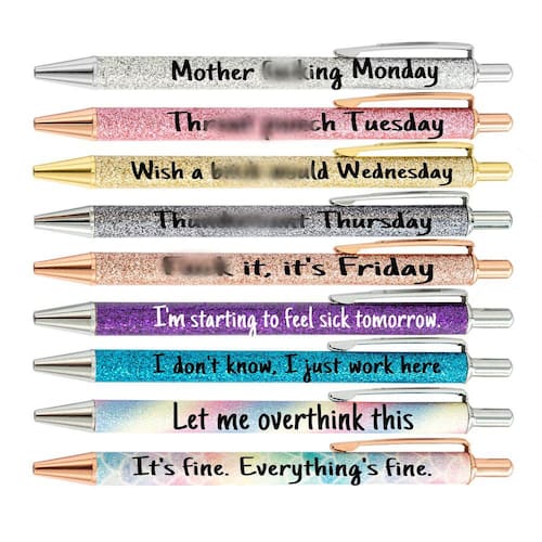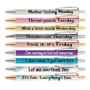 ??Detalhes da embalagem?Obtenha 9 canetas esferográficas Funny Week Mood em uma variedade de cores, incluindo ouro rosa, prata, ouro, rosa, azul, roxo, cinza e 2 cores do arco-íris. Além disso, uma bolsa de canetas conveniente para mantê-los todos juntos.