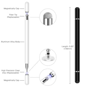Uso abrangente As canetas Stylus capacitivas de disco magnético se aplicam para jogar, ficar, desenhar, escrever, assinar, fazer anotações e ilustrações. A ponta da caneta do disco é clara e fina, o que permite que você veja através e dá a você o ponto preciso ao desenhar para artista. Como mudar a ponta do disco O novo disco está do outro lado coberto pela tampa de prata, aparafuse a tampa e você verá a ponta do disco. Para substituir a ponta do disco, puxe-a para fora segurando a parte central da pequena barra de metal e, em seguida, empurre uma nova ponta de disco na caneta. Cuidados: 1. Esta caneta Stylus não suporta rejeição da palma da mão, certifique-se de que suas mãos não fiquem na tela. 2. Não remova o disco de plástico no final da ponta, se você mover o disco, a ponta fina não funcionará. 3. Se a caneta ficar atrasada e não conseguir escrever suavemente no dispositivo, talvez o dispositivo não funcione corretamente, reinicie o dispositivo ou desligue outros aplicativos. 4. Você pode deslizar a tela, mas não pode escrever em um aplicativo específico, verifique as configurações do aplicativo ou confirme se o aplicativo suporta funções de caligrafia. 5. Normalmente, não causa arranhões em uma tela sensível ao toque, mas ainda sugerimos que você use um protetor de tela no seu dispositivo para proteger a tela de qualquer possível dano/arranhões que possam ser causados por sujeira no disco/tela, pontas danificadas ou produto defeituoso de baixa probabilidade. 6. Se você suspeitar que seu disco foi danificado de alguma forma, interrompa o uso. Um disco danificado pode arranhar a tela. Substitua-o por um novo disco. Conteúdo da embalagem: 2 canetas Stylus de disco magnético (preto/branco) 2 pontas de disco substituíveis. 2 pontas de fibra substituíveis. 2 tampas magnéticas extras. Nossa credibilidade Fornecemos 3 meses de devolução do dinheiro e 1 ano de garantia, então basta adicioná-la ao seu carrinho agora! - Esta caneta stylus de ponta dupla tem uma ponta de fibra de 0,6 cm e uma ponta de disco transparente de 0,7 cm, com um corpo de alumínio leve para uma aderência confortável. 15,7 cm de comprimento, 14,7 g - Ponta de disco transparente de alta precisão, transparente e fina, oferece a melhor referência visual ao marcar, garantindo uma operação precisa e sem atrasos - Design da tampa magnética: as duas tampas se fixam magneticamente às duas extremidades da caneta, protegendo de forma ideal as duas pontas de danos e perdas - Compatível com todos os dispositivos com tela sensível ao toque, como iPad, iPhone, smartphones, tablets e laptops - Lembrete amigável: a caneta stylus foi projetada para substituir os dedos. Sem bateria, sem conexão Bluetooth, pronta para usar. Ao usar determinados aplicativos no iPad, desconecte o lápis ativo ou ajuste as configurações dentro do aplicativo. Para obter mais detalhes, consulte o Guia de configuração do aplicativo. - Pesquise as pontas de substituição StylusHome ASIN: B08L34JX24 ou B08L355KQV - 2 anos de garantia limitada. Suporte ao cliente 24 horas por dia, 7 dias por semana, devoluções gratuitas sem perguntas