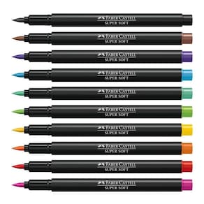 As canetinhas hidrográficas Faber-Castell da linha SuperSoft tem seu design arrojado e moderno, com a ponta pincel (brush) supermacia, perfeita para técnicas de Lettering e desenhos artísticos. A embalagem é reutilizável e 100% reciclável e a tinta é lavável e atóxica.