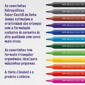 **AVISO: ESTAMOS TRABALHANDO NORMALMENTE COM TODOS ITENS COM ENVIOS*** As canetinhas hidrográficas Faber-Castell da linha Jumbo estimulam a criatividade das crianças com a formulação exclusiva de corantes de alta qualidade com cores mais vivas. As canetinhas tem formato triangular ergonômico, ideal para mãozinhas pequenas. Sua ponta é super-resistente, a tinta é lavável e o produto é atóxico.