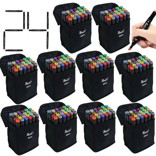As canetas são de ponta dupla, duas pontas padrão, grossa e fina. Os marcadores são a base de álcool e não contém cheiro, ideal para crianças.