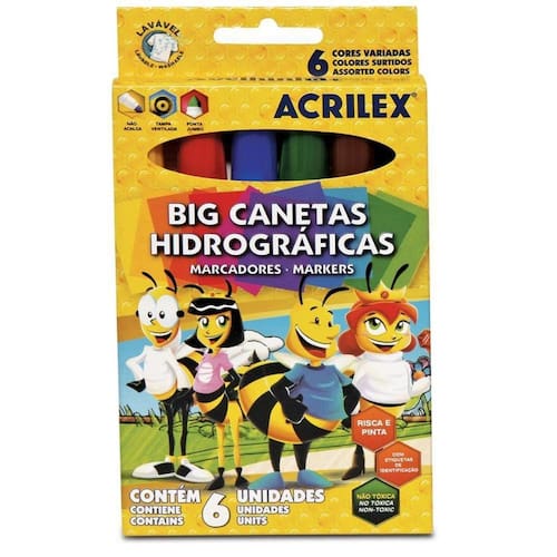 Canetinhas Hidrográficas Acrilex 6 Cores 06936 Canetas hidrográficas de ponta grossa e resistente. Ideal para trabalhos escolares de desenhar, pintar e fazer tracejados sobre papel, papel cartão e cartolina. - Contém 6 marcadores coloridos - Tipo de ponta: redonda e jumbo - Core: laranja, vermelho, azul, verde, marrom e preto - Lavável - Identificação por tampa